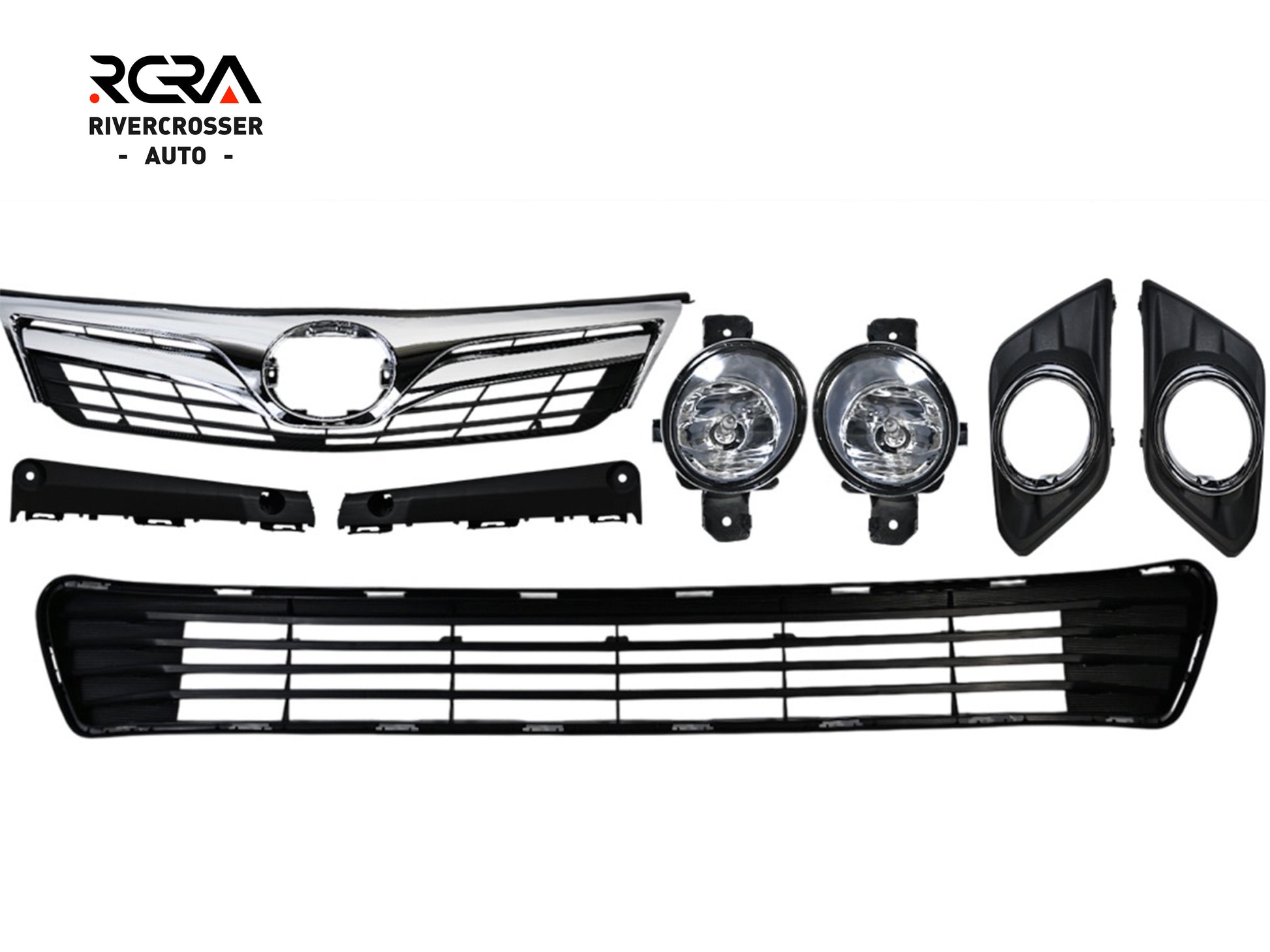 This grille set is aftermarket auto part. It is compatible with original grille assembly in 2012-2014 Toyota Camry L/LE/XLE. It comes with halogen fog lights. It is designed to replace directly the original grille assembly. It is made from high quality material which makes grille more durable and solid, so not only protection of front end of the vehicle but also airflow of radiator and engine will be improved.